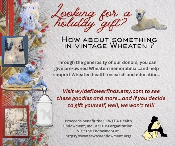 The SCWTCA Endowment Inc. was created in 2001 by the Soft Coated Wheaten Terrier Club of America, Inc. as a 501c3 to support research and projects that will increase knowledge about as well as improve health issues affecting Wheaten Terriers.